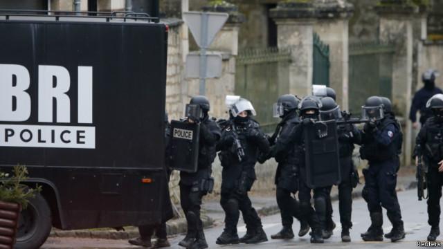 ماموران ویژه پلیس فرانسه در جستجوی خانه به خانه در منطقهای در شمال شرق پاریس. دو مظنون حملههای دیروز در یک مجتمع خدماتی بینراهی در این منطقه دیده شدهاند.