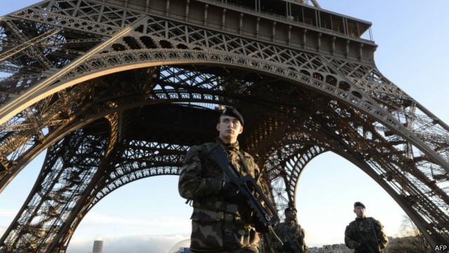 نظامیان در حال گشتزنی در حوالی برج ایفل در پاریس.